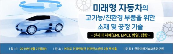 한국미래기술교육연구원(대표 박희정)은 오는 8월 27일 서울 여의도 전경련 회관에서 '미래형 자동차의 고기능·친환경 부품을 위한 소재 및 공정기술 세미나: 전자파 차폐(EMI, EMC), 방열, 접합'를 개최한다.