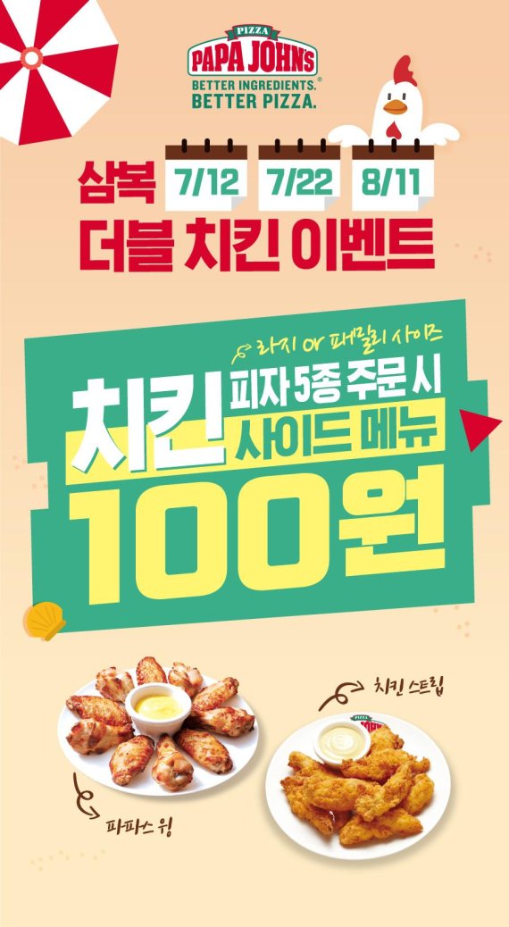 파파존스 피자는 삼복 당일에 치킨이 토핑된 파파존스 피자를 주문하면 치킨 사이드 메뉴 ‘치킨 스트립’과 ‘파파스 윙’ 2종 중 1종을 단돈 100원에 제공하는 행사를 벌인다. 행사 대상은 ‘스파이시 치킨랜치’, ‘치킨 바베큐’, ‘핫 치킨 바베큐’, ‘치킨 수퍼파파스’, ‘멜로우 머쉬룸’로, 라지 및 패밀리 사이즈 피자에 한해 혜택이 적용된다.