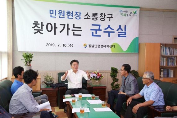 김광철 연천군수는 10일 장남면 행정복지센터에서 7월 찾아가는 군수실을 운영했다. 주민은 지역의 오랜 숙원사항인 학생들이 제시간에 학교에 등교할 수 있도록 따복버스 운행 조정을 요청하고 주산지 일관기계화 사업 추진 시 임대 농기계 구입기종 중 인삼 작업에 필요한 지게차를 지원받을 수 있도록 적극 검토를 요청했다.
