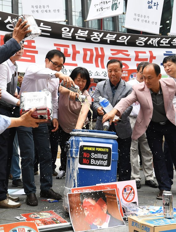 한국중소상인자영업자총연합회 회원들이 15일 서울 종로구 옛 주한 일본대사관 앞에서 '일본제품 판매중단 확대선포 기자회견'을 열고 일본기업 제품을 쓰레기통에 버리는 퍼포먼스를 하고 있다. 이들은 담배 및 주류 위주로 판매중단 운동을 벌이다 13일부터 음료, 조미료 및 소스류 등으로 범위를 확대했다고 밝혔다. 사진=김범석 기자
