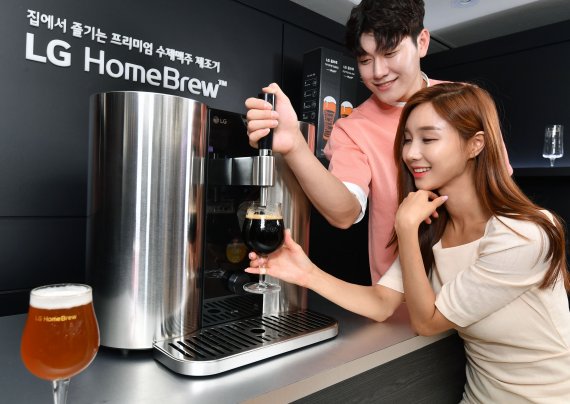 LG전자 캡슐맥주제조기 'LG 홈브루' 출시행사가 16일 서울 세종대로 주한 영국대사관에서 열려 홍보도우미들이 맥주제조기를 시연하고 있다. 사진=서동일 기자