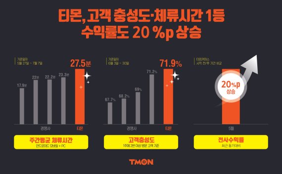 해당 기간 티몬 이용자의 주간 평균 체류시간은 27.5분으로 쿠팡(23.3분), 지마켓(22.2분), 위메프(22분), 11번가(17.9분)보다 길었다.