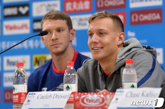 19일 오전 광주 광산구 남부대학교 MPC(Main Press Center) 기자회견장에서 열린 미국 수영 대표팀 기자회견에서 카엘렙 드레셀은 언론의 관심을 한 몸에 받았다.