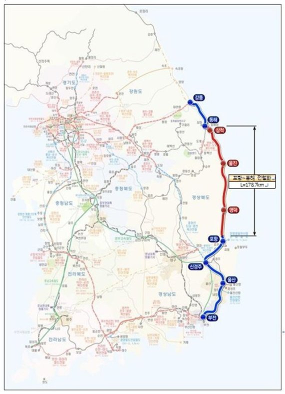 22일 국토부는 동해선 포항~동해 178.7㎞ 구간의 전철화 사업 추진을 위한 송변전설비 기본 및 실시설계 용역을 착수한다고 22일 밝혔다.