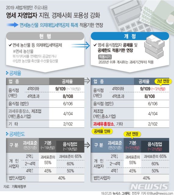 정부는 매출액이 4억원에 미치지 못하는 영세한 개인 음식점에 대한 공제율 특례를 2년 더 연장해 제공하기로 했다. 동시에 개인 사업자에 적용되는 공제 한도 특례도 2년 연장한다. 특례 상 한도는 매출액이 4억원 이하일 때 55%, 4억원 초과일 때 45%로 이미 기본 한도보다 5%포인트(p)가 높은데 음식점업에 종사하는 경우 각각 60%, 50%로 더 상향된다. 매출액이 2억원 이하인 사업자에는 65%까지 적용한다.