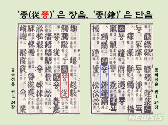 일례로, 땡땡땡 울리는 ‘종(鐘)’은 단음이고, 노비의 동의어인 ‘종’은 장음이다. 그 둘의 장단음 구별 문제는 ‘종(從)’을 <사진>에서처럼 우리말 바른 한자음의 지침서인 ‘동국정운’에 기재된 ‘쭁(從)’으로 표기하면 해결될 것이다. 우리 발음은 지금도 상당수 동국정운의 발음을 유지하고 있다.