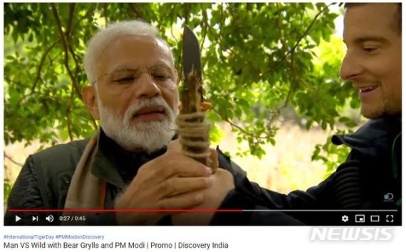 모디 총리는 예고편에서 야생 나뭇가지로 만든 창을 들고 수풀을 헤치면서 사냥을 하고, 비에 젖은 채 그릴스와 함께 강가에 앉아 있는 모습이 공개됐다.
