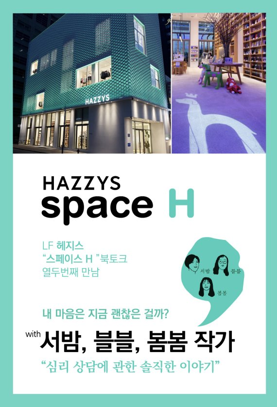 (서울=뉴스1) 이승환 기자 = 생활문화기업 LF의 의류 브랜드 헤지스는 오는 13일 플래그십 스토어 '스페이스 H' 1층에서 북토크를 연다고 5일 밝혔다. '서밤' '블블' '봄봄' 등 3명의 작가가 참여해 심리 상담을 주제로 진행한다.
