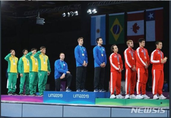 美펜싱 국가대표, 팬암대회 금메달 시상대서 무릎 세리머니