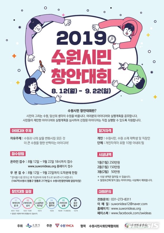 올해는 ‘수원과 나의 삶을 변화시킬 모든 것, 더 큰 수원을 향한 반짝이는 아이디어!’를 주제로 진행된다. 공모 분야는 ▲환경 ▲문화 ▲복지 ▲안전 ▲교통 ▲여성 ▲식생활 ▲지역경제 등이다.