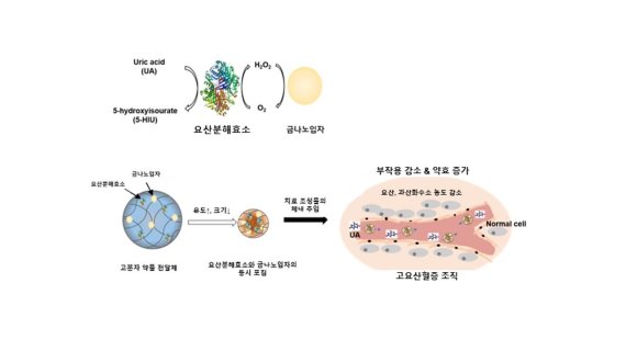 온도 조절로 크기를 변화시킬 수 있는 고분자 나노전달체에 효소와 금 나노입자를 원하는 비율로 포집하고 체내로 전달함으로써 효소와 금 나노입자가 혈액에서 희석되지 않도록 한 것이다. 이를 통해 과산화수소 농도를 감소시키는 한편 이로 인한 요산 분해 효과를 오래 유지할 수 있도록 했다.