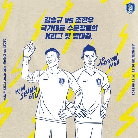 (서울=뉴스1) 임성일 기자 = 지난 11일 울산종합운동장에서 열린 울산현대와 대구FC의 경기를 앞두고 대한축구협회는 공식 SNS 계정에 '김승규vs조현우 국가대표 수문장들의 K리그 첫 맞대결'이라는 문구와 함께 두 선수의 캐리커처를 게재했다. 이례적인 일이었다.