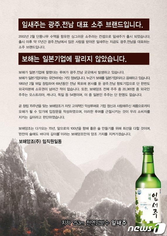 보해양조는 "한일 갈등이 격화되는 상황에서 '일본매각설' 등 터무니없는 루머로 기업 이미지 등에서 큰 피해를 겪고 있다"며 "외국 자본에 넘어갔다는 등 왜곡된 정보가 시장과 소비자들을 현혹하고 있다"고 밝혔다.