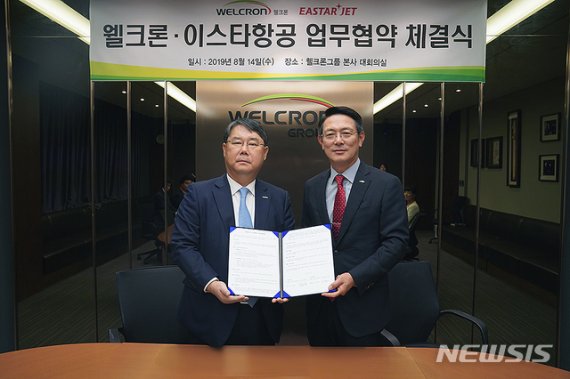 이번 체결식은 웰크론 서울 구로동 본사에서 진행됐다. 현장에는 이영규 웰크론그룹 회장과 최종구 이스타항공 사장이 참석했다.