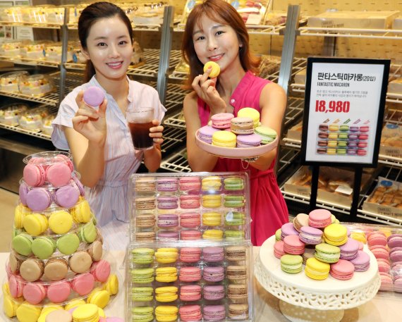 15일 이마트 트레이더스 월계점에서 모델들이 대용량 초저가 마카롱인 '판타스틱 마카롱'을 소개하고 있다. 트레이더스는 매장 내 베이커리 매장인 ‘트레이더스 베이커리’에서 마카롱 20개로 구성된 1세트(540g)를 1만 8980원에 판매한다.