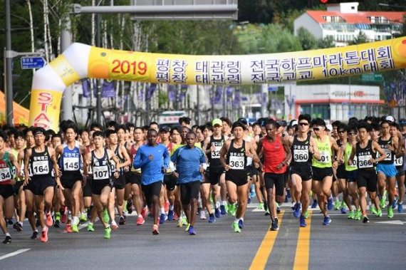 【평창=서정욱 기자】16일 대관령면 일원에서 열린‘2019 HAPPY700평창 대관령 전국하프마라톤대회 및 전국 고교 10km대회에 참가한 선수들이 한여름 폭염속 해발700m를 달리고 있다. 사진=평창군 제공