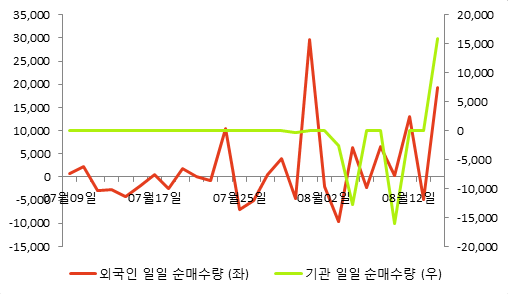최근 5일간 동종목의 외국인 투자자는 34,411주 순매수하였고 반면 기관은 15,934주 순매도하였다. 전날 두 주체 각각 19,223주, 15,934주 순매수하며 보유 비율을 늘렸다.