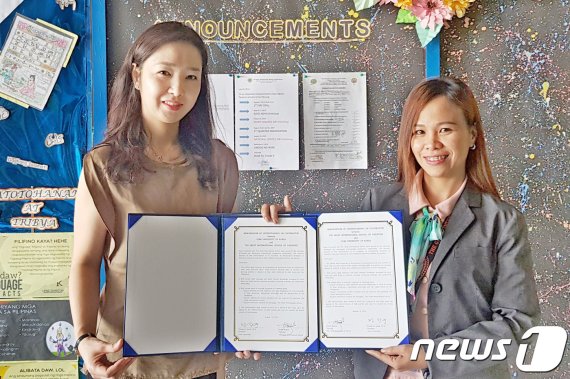 16일 구미대학교 유아교육과 필리핀 봉사단의 이지예 지도교수(왼쪽)가 필리핀에서 그레이트 국제학교 다이린 모고트 교장과 유아교육에 관한 협약을 체결한 뒤 기념촬영을 하고 있다.(구미대 제공)2019.8.16./뉴스1© 뉴스1