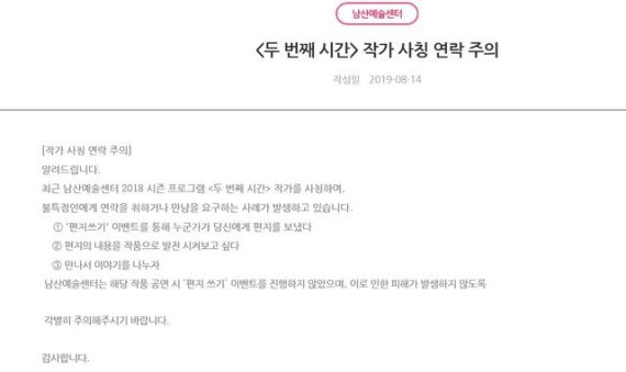 서울문화재단 남산예술센터는 "2018 시즌 프로그램 '두 번째 시간' 작가를 사칭, 불특정인에게 연락을 취하거나 만남을 요구하는 사례가 발생하고 있다"고 공지했다.