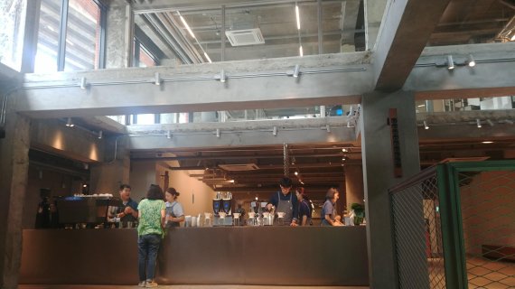 블루보틀의 콘셉트는 '아날로그'에 가깝다. 투박한 빨간 벽돌로 이뤄진 건물 외관부터가 그렇다. 내부 역시 건물 골조가 훤히 보이고 울퉁불퉁한 회색 벽으로 꾸며져 있다. 카운터에선 7~8명의 직원들이 주문을 받고 커피를 내리고 있었다.
