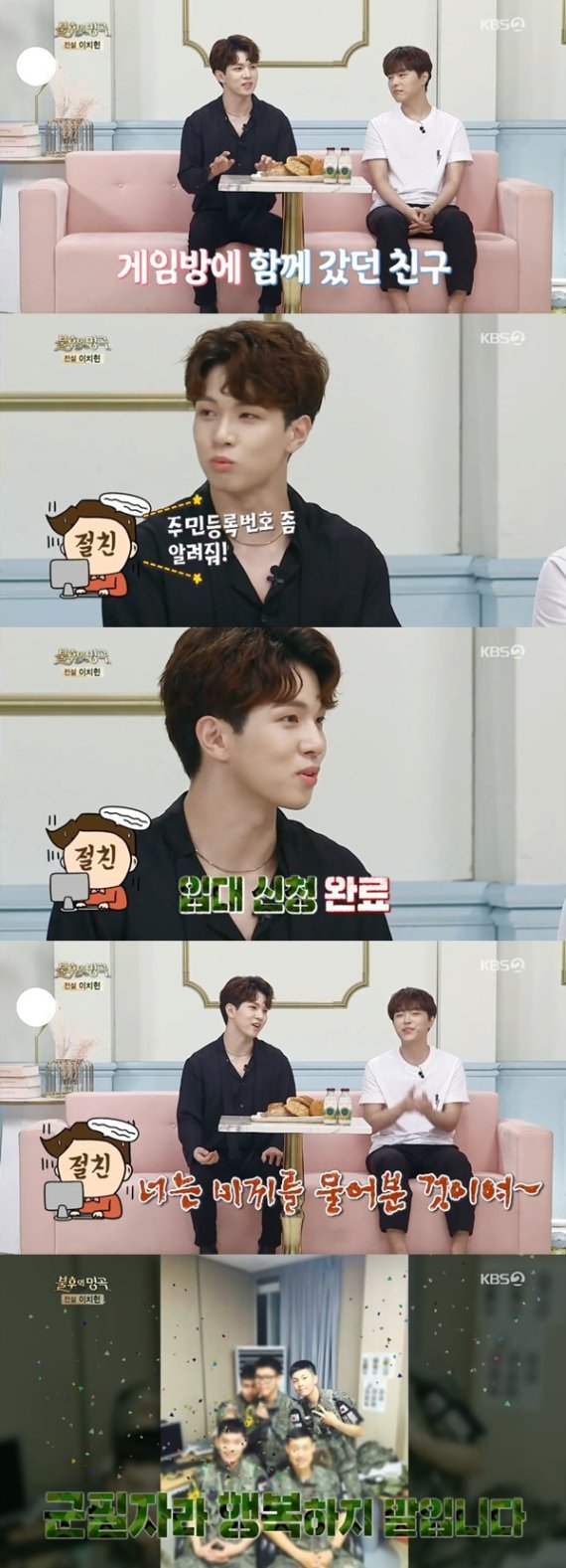 이날 엔플라잉의 유회승은 일찍 군대에 가게 된 사연에 대해 밝혔다. 유회승은 "게임방에 친구와 함께 가서 주민등록 번호와 비밀번호를 알려줬다"고 말했다.