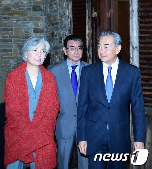 환영 만찬에선 왕이(王毅) 중국 외교 담당 국무위원 겸 외교부장이 가운데에 앉고 양 옆에 강경화 장관과 고노 외무상이 자리를 잡았지만 서로 대화는 나누지 않은 것으로 전해진다.