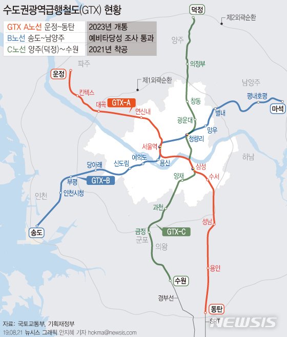 현재 사업 추진 속도가 가장 빠른 A노선이 2023년 개통을 목표로 공사를 진행중이며 이어 C노선이 2021년, B노선이 2022년 순차적으로 착공에 들어갈 예정이다. 이르면 2027년께 3개 노선이 모두 개통돼 수도권 교통혼잡 문제가 획기적으로 개선될 것으로 기대된다.