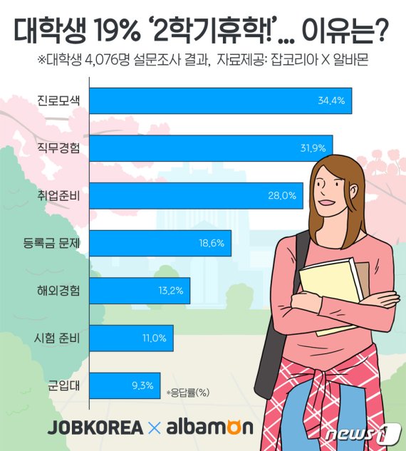 이번 공동 설문조사에 따르면 대학생 19.0%가 '2학기를 휴학할 것'이라 답했다. 응답자의 학년이 높을수록 휴학 의사도 높았다. 4학년의 휴학 의사는 27.9%로 가장 높았으며 3학년 20.2%, 2학년 16.0%, 1학년은 12.8% 순이었다.