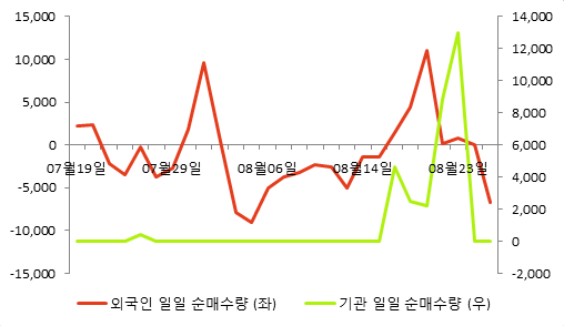 다음 표는 동종목의 외국인, 기관의 일별 순매수량을 나타낸 것이다.