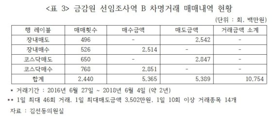 김 의원은 "자본시장 불공정거래 행위를 감독하는 금감원 임직원이 주식차명거래 범죄를 저지른 것도 경악할 사안인데, 규정에 따른 검찰고발 조치도 하지 않아 사법체계를 무력화 시킨 것은 더 큰 문제"라며 "향후 증선위와 금감원에 대한 국정감사를 통해 위법한 행정행위의 전말을 파악하고, 금감원 임직원의 주식차명거래 금지할 수 있는 제도적 장치를 마련하겠다"고 말했다.