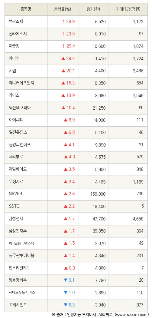 특히 백광소재는 전 거래일 대비 29.9% 오른 6,520원에 거래를 마감하여 높은 관심을 받았다. 이외에 고려시멘트는 4,655원까지 올라 신고가를 경신했으나, 전일보다 오히려 하락한 3,940원에 거래를 마감했다.