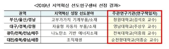 이에 과기부는 2019년 지역혁신 선도연구센터로 창원대(부산․울산․경남), 영남대(대구․경북․강원), 전북대(광주․전북․전남․제주), 순천향대(대전․충북․충남․세종), 총 4개 대학을 신규 선정했다.
