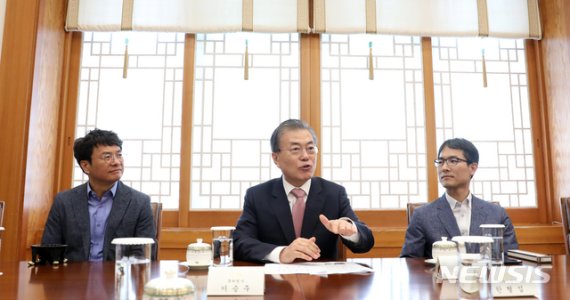 문 대통령은 기술개발 과정에서의 일화와 지식재산 정책에 대한 참석자들의 의견을 경청했다.