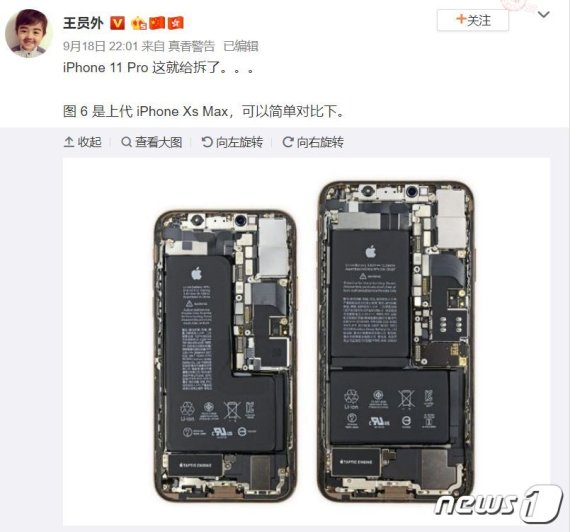 실제로 왕위안와이(王员外)라는 중국의 한 웨이보 이용자가 공개한 아이폰11 프로 모델의 의 분해 사진을 보면 해당 모델은 이전 시리즈보다 큰 'L자형 배터리'를 탑재하고 있었다.