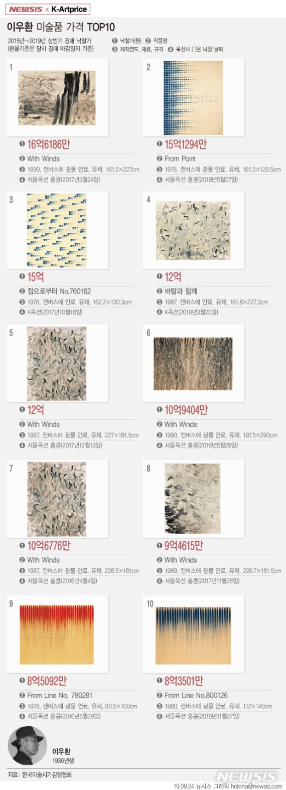2015년부터 2019년 상반기 현재까지 팔린 450점중 이우환의 최고가 TOP 10를 집계했다. (그래픽 참고)