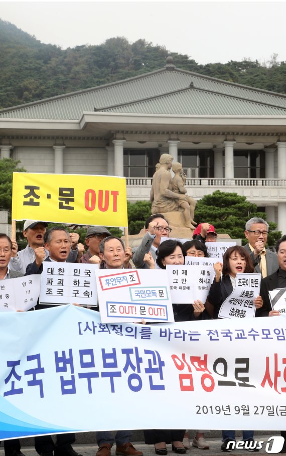 [파이낸셜뉴스] '사회정의를 바라는 전국교수 모임'(정교모)은 27일 청와대에서 기자회견을 열고 조국 법무부 장관의 사퇴를 촉구하는 대학교수들 명단을 공개했다.
