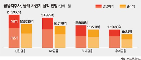 4·4분기에도 이같은 순위 구도는 지속될 것이라는 관측이 나온다. 4·4분기 신한금융의 순이익은 6533억원, KB금융은 5751억원을 기록할 것으로 전망되며, 하나금융의 순이익은 5059억원, 우리금융은 3519억원을 나타낼 것으로 예상된다. 4·4분기 영업이익 전망치는 신한금융 9351억원, KB금융 8085억원, 하나금융 7145억원, 우리금융 4644억원 순이다. 금융권 관계자는 "신한금융의 하반기 비이자이익이 전년 대비 50%에 육박하는 가파른 증가세를 나타낼 것으로 전망되는 등 실적 우위에 주요한 영향을 미칠 것으로 보인다"고 전했다.