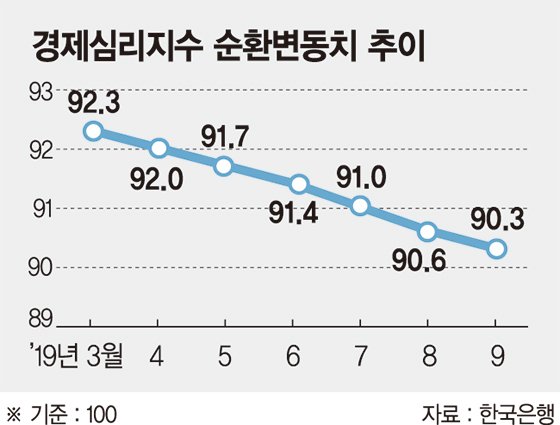 9월 ESI순환변동치는 0.3포인트 떨어진 90.3으로 2017년 12월(-0.1포인트) 이후 1년10개월(22개월) 연속 내림세를 지속한 것이다. 지수로는 지난 2009년 5월 87.2 이후 10년3개월 만에 최저치다. 계절성 등을 제거했을 때 전반적 경제심리가 사실상 횡보했다는 의미다.