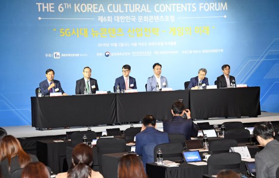 제6회 대한민국 문화콘텐츠포럼이 파이낸셜뉴스 주최로"5G시대 뉴콘텐츠 산업전략-게임의 미래" 란 주제로 2일 서울 여의도 콘래드호텔에서 개막됐다. 서병문 콘텐츠미래연구회 회장(왼쪽 첫 번째)이 좌장으로 패널 토론이 열리고 있다. 왼쪽부터 서병문 콘텐츠미래연구회 회장, 서태건 가천대학교 게임대학원 원장, 정석희 (사)한국게임개발자협회 회장, 이장주 이락디지털문화연구소 소장, 황보택근 가천대학교 연구산학 부총장, 박승범 문화체육관광부 게임콘텐츠산업과 과장. 사진=박범준 기자