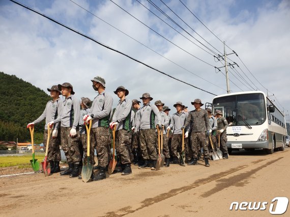 산사태로 마을 진입로가 막힌 울진군 매화면 금매2리로 달려온 육군 장병들은 총 대신 삽을 들고 토사에 파묻힌 승용차와 집안까지 밀고 들어온 토사를 치웠다.