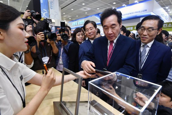 이낙연 국무총리(오른쪽 두번째)가 8일 서울 영동대로 코엑스에서 막을 올린 한국전자산업대전 2019에서 삼성전자 부스를 방문, 폴더블폰 '갤럭시 폴드'를 살펴보고 있다.