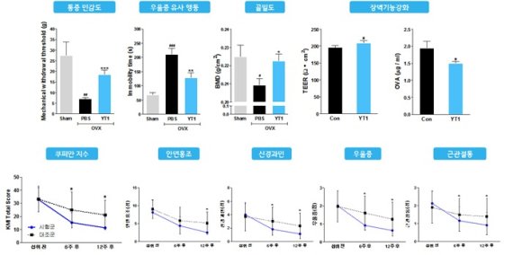 식품연은 '에스트로겐-장내미생물 상관 분석 연구'를 통해 'YT1'을 개발했다. 갱년기 실험 모델에서 YT1를 투여해 골밀도 증가, 통증 민감도 완화, 우울증 유사행동 개선 효과, 장벽강화 활성 효과를 확인했다. 인체적용시험을 통해서도 갱년기 증상을 점수화해 갱년기 장애 정도를 파악하는 대표적인 평가지표인 '쿠퍼만 지수'(KI)와 '삶의 질 척도'도 개선되는 것을 확인했다.