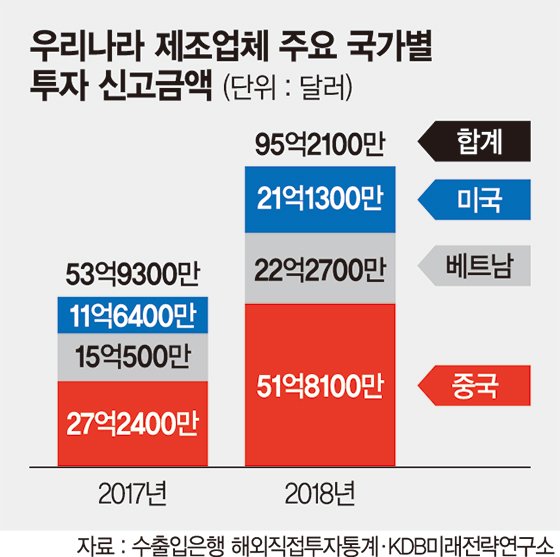 13일 산업은행 KDB미래전략연구소와 관련업계에 따르면 국내 제조업들의 중국·베트남·미국 등 3국에 대한 투자신고액은 지난 2017년 53억9300만달러에서 2018년 95억2100만달러로 급증했다. 미국 투자신고액은 11억6400만달러(2017년)에서 21억1300만달러(2018년)로, 베트남은 15억500만달러에서 22억2700만달러로, 중국은 27억2400만달러에서 51억8100만달러로 각각 늘었다. 중국·베트남에 대한 반도체·디스플레이·전자 및 통신장비 투자가 늘었고, 미국에는 도널드 트럼드 대통령의 보호무역 등으로 가전·자동차·화학 투자가 증가했다.