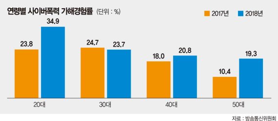 연령별로는 20대의 사이버폭력 경험률(34.9%)이 가장 높았다. 30대(23.7%), 40대(20.8%), 50대(19.3%)로 나이가 어릴수록 사이버 폭력 가해경험자 비율이 높았다.