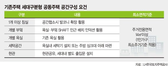 16일 관련 업계 등에 따르면 국토교통부는 2017년 12월 '주택법' 및 '공동주택관리법'에 따라 기존 공동주택을 세대 구분해 활용하기 위한 '세대구분 설치 가이드 라인'을 발표했다.