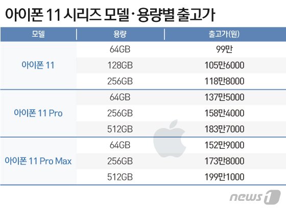 아이폰11은 퍼플, 그린, 옐로, 블랙, 화이트, 레드 등 6가지 색상으로 Δ64기가바이트(GB) 모델 99만원 Δ128GB 모델 105만6000원 Δ256GB 모델은 118만8000원으로 출시된다.