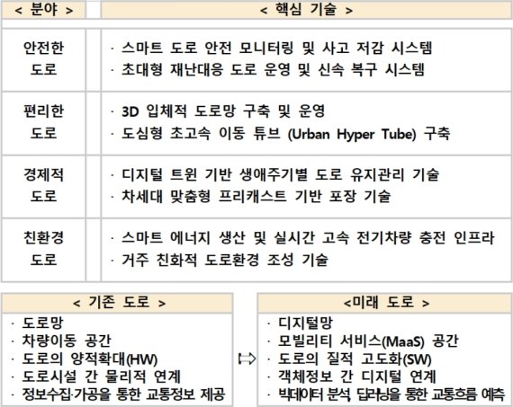 국토부는 Δ안전한 도로(교통사고 사망자 수 30% 감축 지원) Δ편리한 도로(도로 혼잡구간 30% 해소) Δ경제적 도로(도로 유지관리 비용 30% 절감) Δ친환경 도로(도로 소음 20%, 미세먼지 등 유해물질 15% 감축) 등 4대 핵심분야를 선정해 2030년까지 목표를 달성하겠다고 밝혔다.