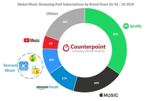 한편 글로벌 시장에서 가장 높은 월간 활성 사용자를 보유한 업체는 텐센트 뮤직으로 QQ뮤직, Kuwo, Kugou등의 계열사를 통해 총 31%의 점유율을 기록하고 있으나, 텐센트 사용자의 90% 이상이 무료 서비스만 사용하고 있는 것으로 나타났다. 텐센트 뮤직은 자체 소셜 미디어 플랫폼을 통해 사용자 기반을 확보할 수 있었지만, 향후 수익구조에 대한 과제는 남아있다.