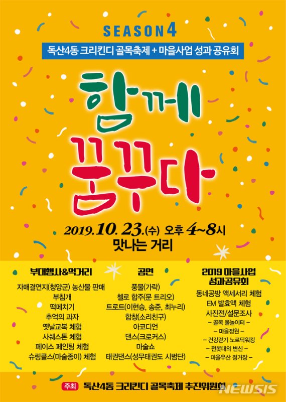 유성훈 금천구청장은 "이번 축제는 독산4동 골목길을 주민들이 힘을 합쳐 지역 문화를 선보이는 사람중심 거리로 만들자는 주민들의 의지가 반영된 의미있는 행사"라며 "주민 모두가 함께 즐기는 주민화합의 축제를 통해 맛나는 거리 지역 상권에 활력을 불어넣길 기대한다"고 말했다.