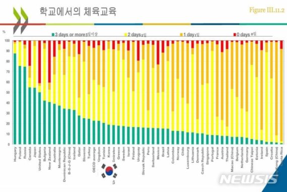 보고서에 따르면 한국은 의무시수는 터키와 칠레에 이어 3위로 높은 편이다. 그러나 일주일에 학교에서 일주일에 체육수업을 실시 빈도는 낮다. 한국은 대체로 일주일에 이틀 정도 체육교육을 실시하지만 미국과 캐나다, 러시아, 일본, 헝가리, 폴란드는 대체로 3일 이상 체육교육을 실시한다.